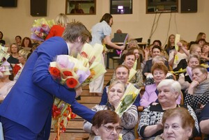 Со сцены звучали самые теплые слова поздравлений. Глава администрации Приозерского района Александр Соклаков поздравил всех присутствующих дам, а после его выступления произошёл трогательный момент: мужчины вынесли в зал сотни цветов — каждый из них нашел свою обладательницу.